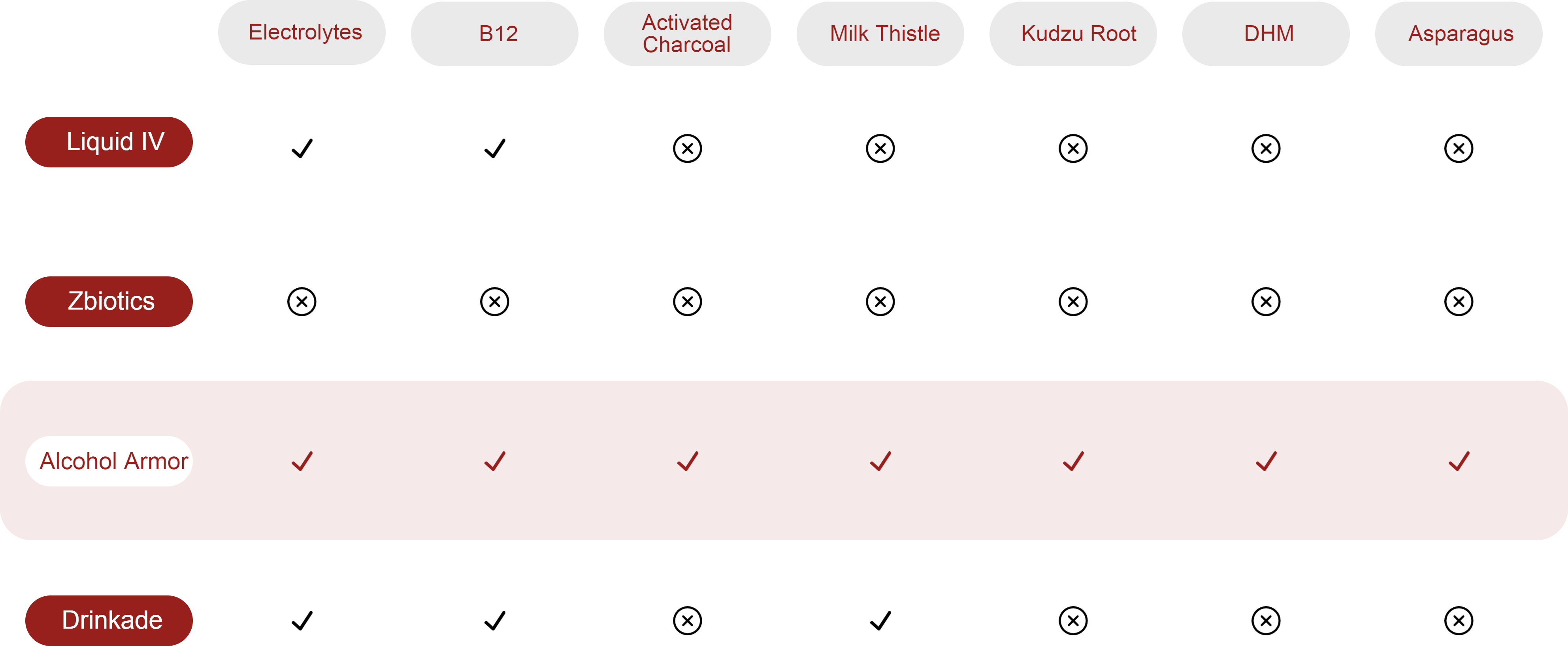 Alcohol Armor® is our carefully crafted blend of immune-boosting ingredients like asparagus and kudzu root, combined with activated charcoal, vitamins, and minerals. This blend aims to support the body's natural defense system, promote liver health, and reinforce our immune system. The formula provides essential nutrients, helping us recover and keep our bodies in top condition.
